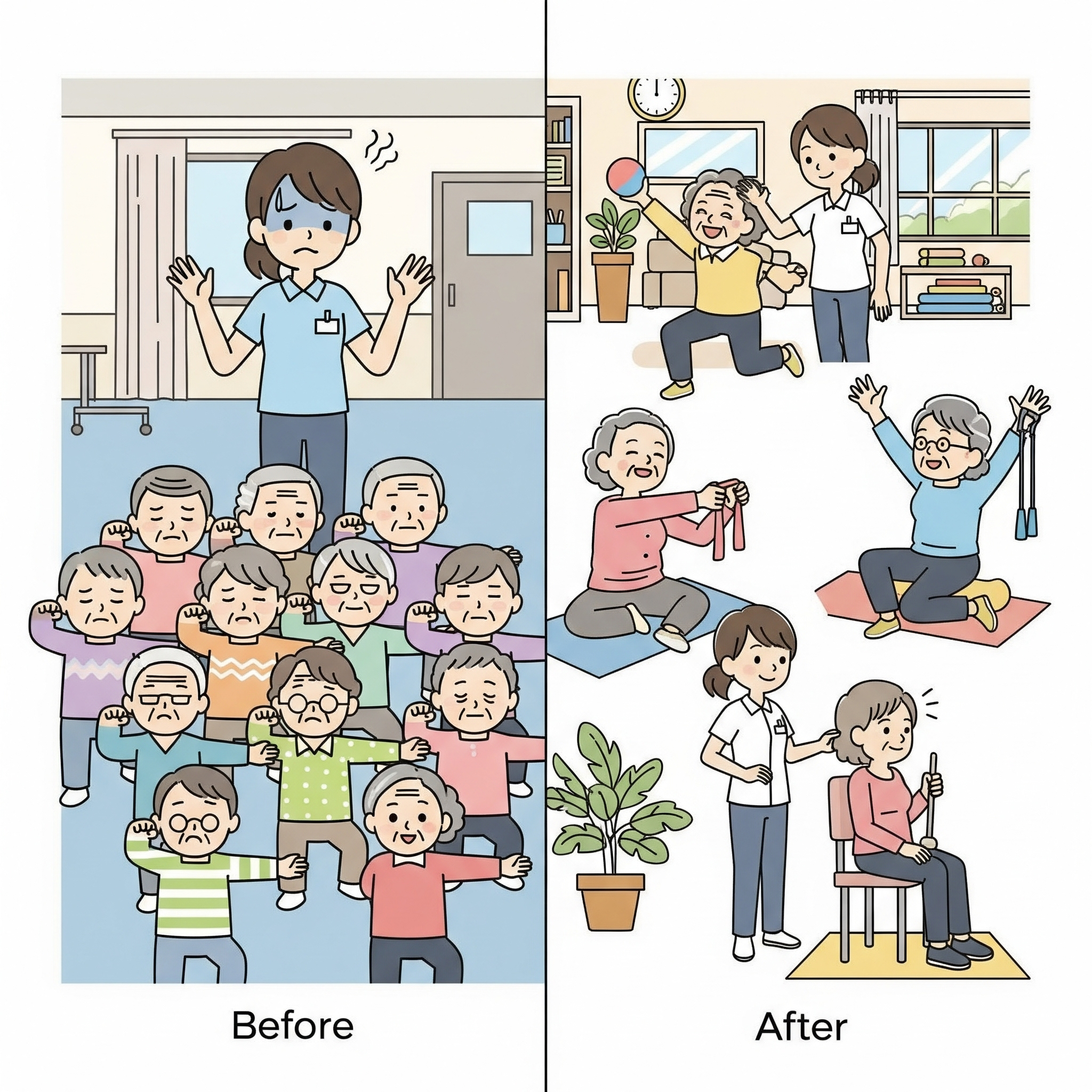 「この方にはこの運動を、これくらいの回数で」という具体的なプランが手元にあるため、スタッフは「何をすればいいか分からない」という不安から解放されます。